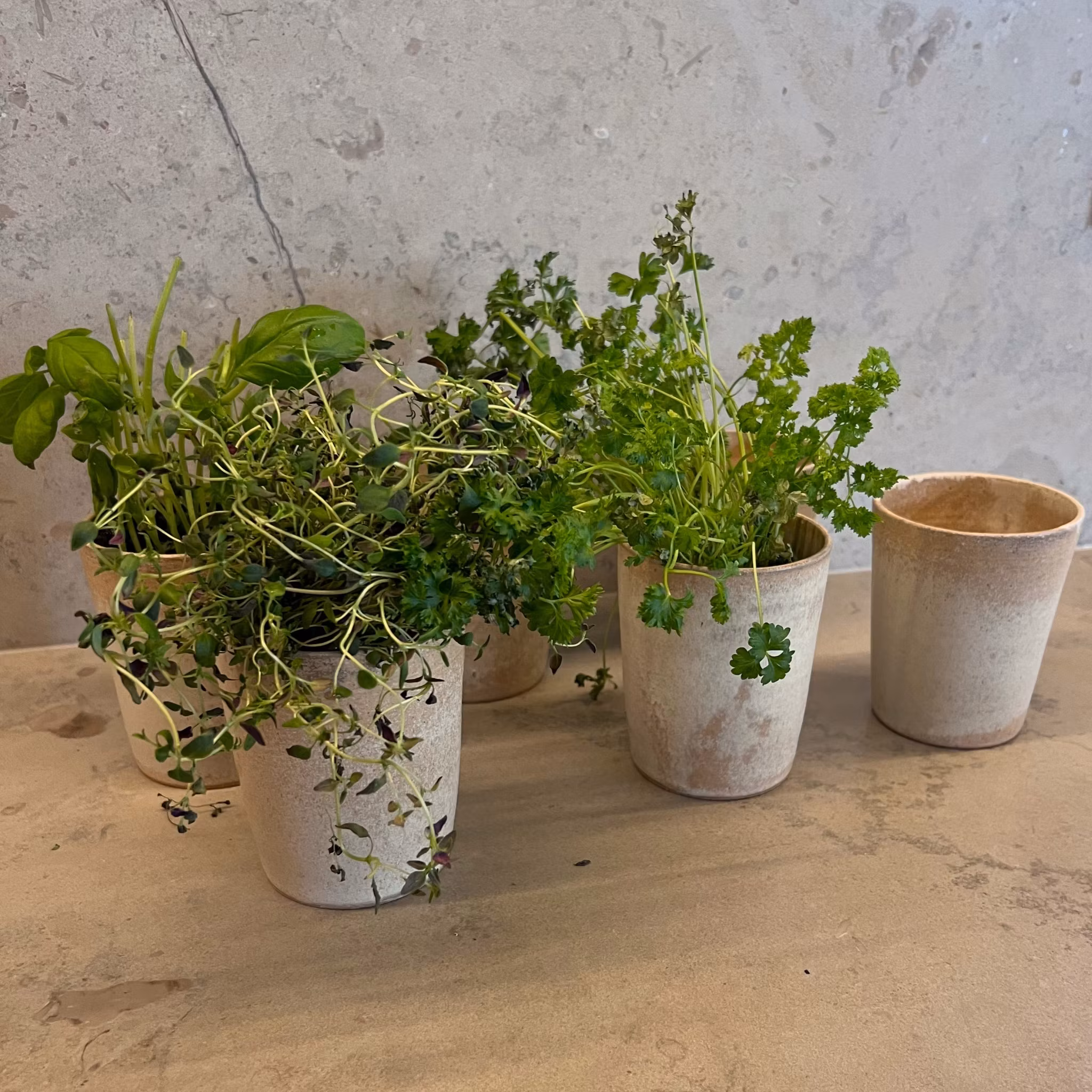 Örtkruka i ljus stengodslera med matt beige melerad glasyr.